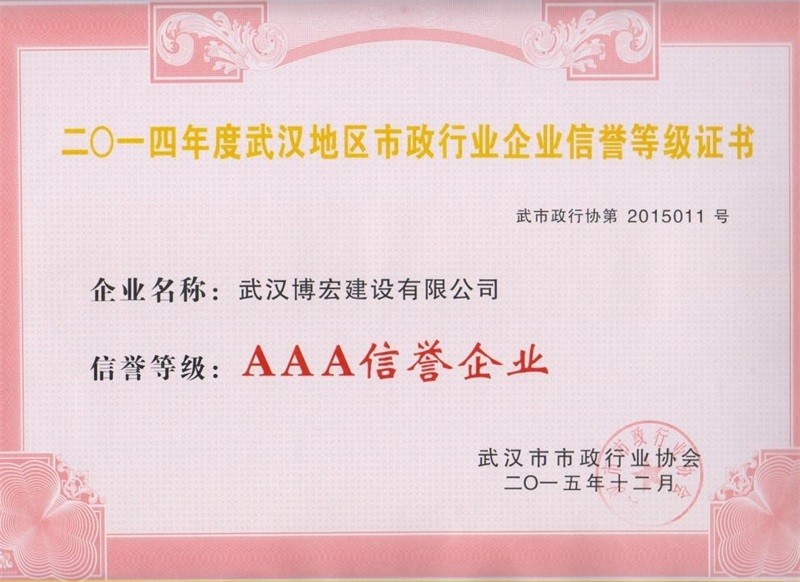2014年度武漢地區市政行政企業信譽等級證書