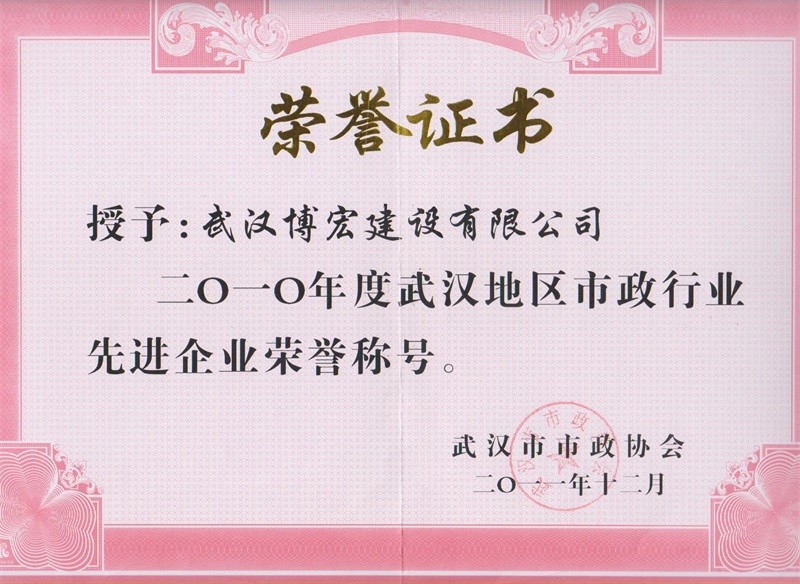 2010年度武漢地區市政行業先進企業榮譽稱號