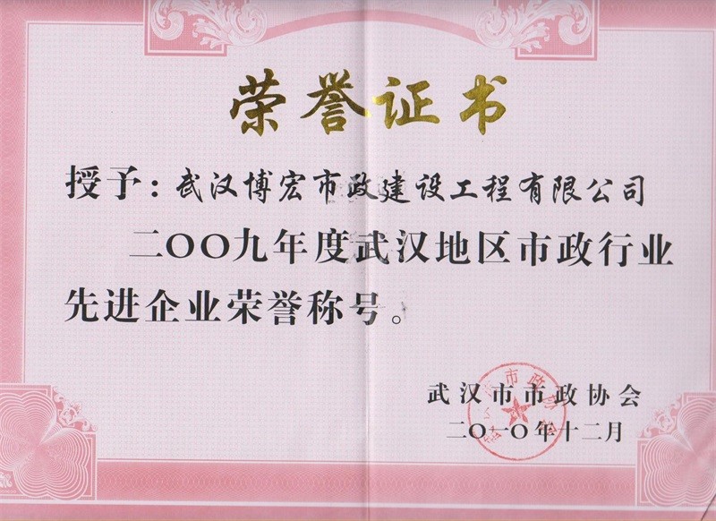2009年度武漢地區(qū)市政行業(yè)先進企業(yè)榮譽稱號