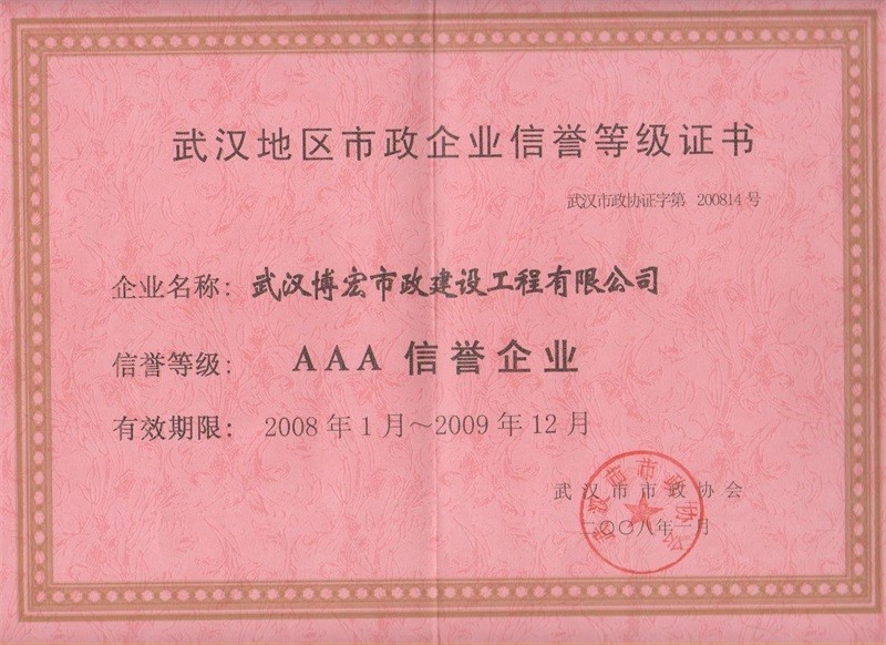 2008-2009年度武漢地區(qū)市政企業(yè)信譽(yù)等級(jí)證書(AAA信譽(yù)企業(yè))