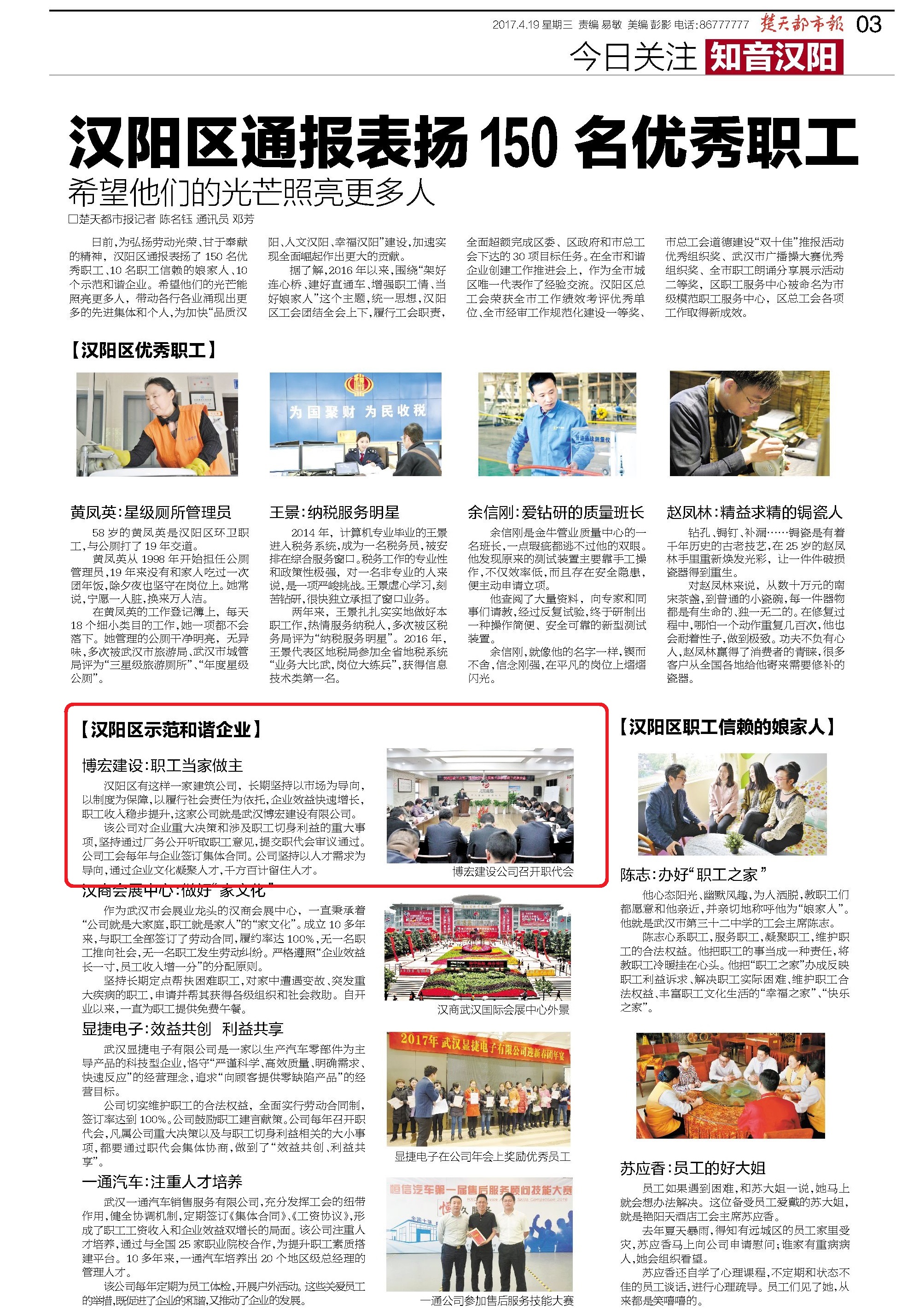 2017419日,楚天都市報知音漢陽板塊報道了漢陽區示范和諧企業獲獎情況,其中我公司博宏建設名列首位。