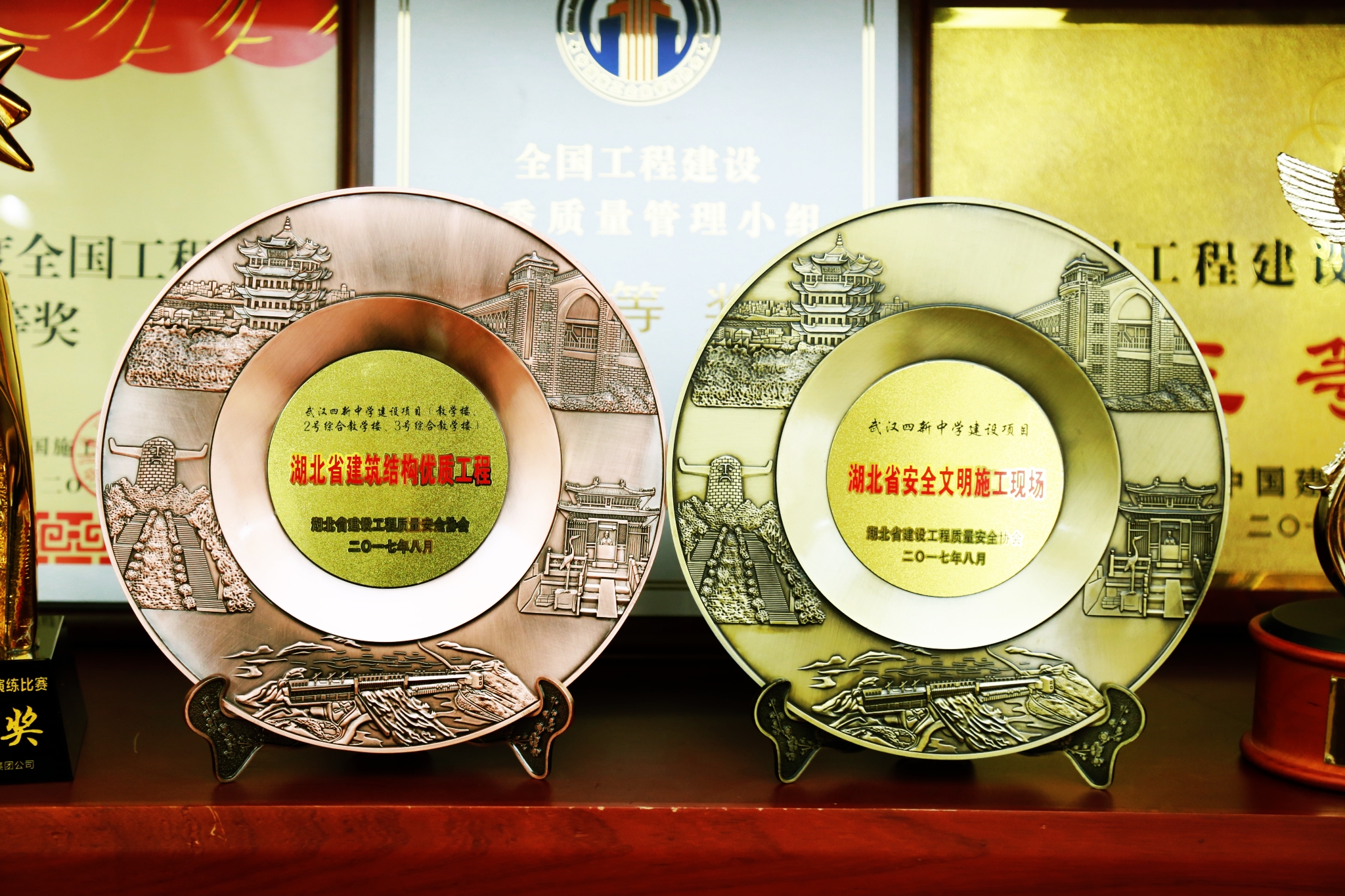 2017年10月11日,武漢四新中學建設項目憑借過硬的建設品質及完善的文明施工管理手段,同時獲得了由湖北省建設工程質量安全協會為其頒發的“湖北省建筑結構優質工程”(2016-2017年度第三批)及“湖北省安全文明施工現場”(2017-2018年度第一批)雙項獎章。
