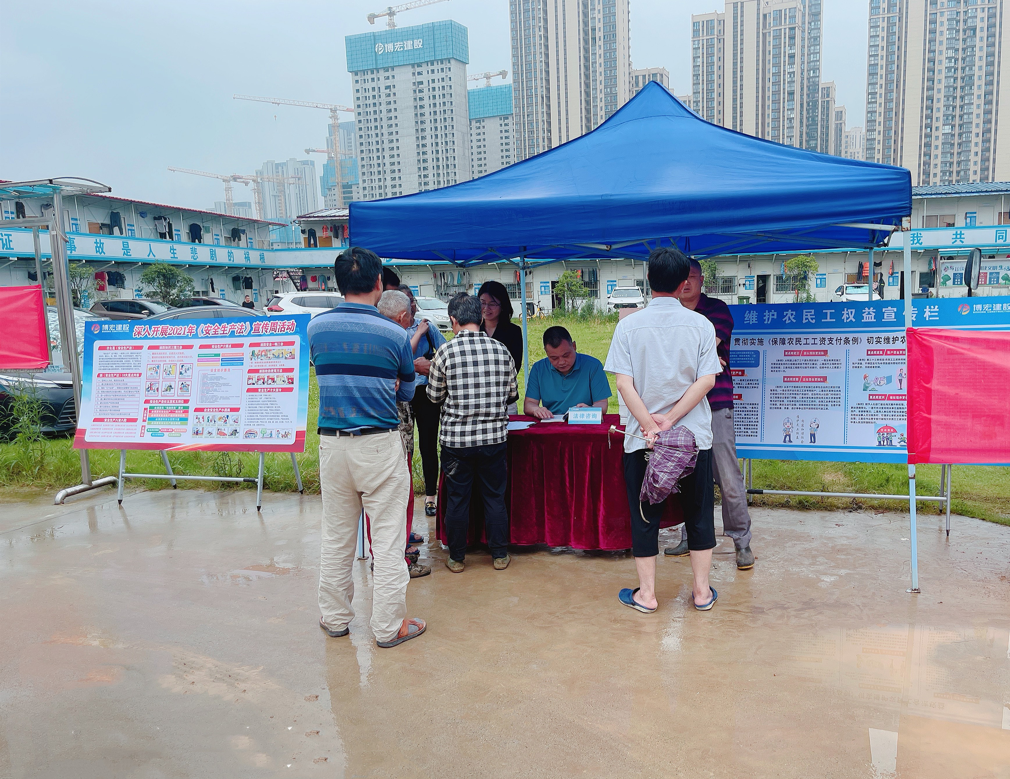 6月19日下午4點(diǎn),“送法進(jìn)工地”普法宣傳活動(dòng)在漢陽(yáng)市政大廈項(xiàng)目部舉辦。活動(dòng)現(xiàn)場(chǎng)通過(guò)懸掛橫幅、發(fā)放普法書(shū)籍、法律咨詢等形式向在場(chǎng)的農(nóng)民工、項(xiàng)目一線員工宣傳與安全生產(chǎn)、農(nóng)民工權(quán)益保護(hù)相關(guān)的基本知識(shí)。