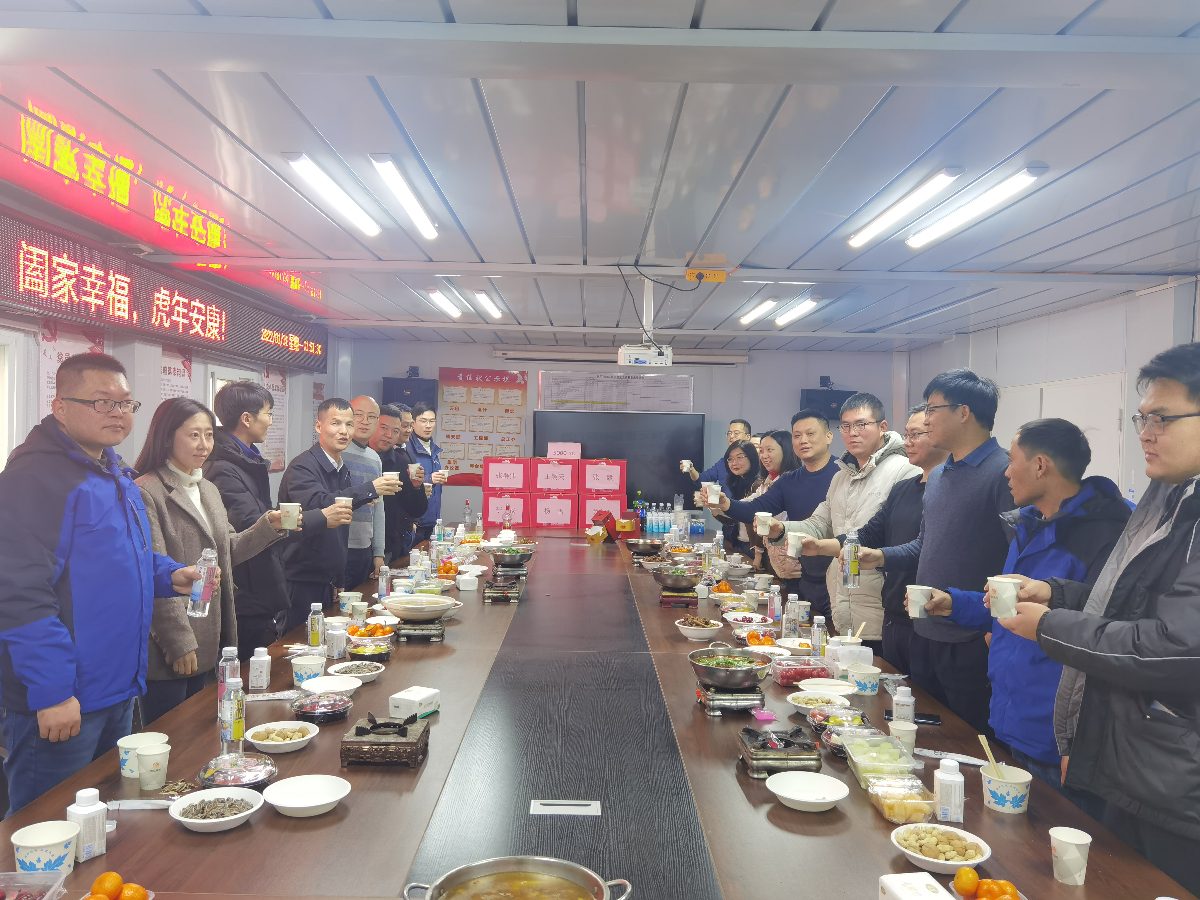 1月31日中午,在除夕這個(gè)特別的日子,在漢陽(yáng)市政建設(shè)大廈項(xiàng)目部,公司就地過(guò)年以及在工地值守的職工圍坐在桌邊,吃了一頓熱乎乎的團(tuán)圓飯,陪他們一起吃團(tuán)圓飯的,還有公司黨支部書(shū)記、董事長(zhǎng)鄒勇,總經(jīng)理蘇琦,黨支部副書(shū)記、工會(huì)主席郭一清,副總經(jīng)理奚雷、辛桂華以及總經(jīng)理助理周昌文、王哲、李磊等領(lǐng)導(dǎo)一行。飯桌前,大家如同一家人一起聊聊家常、看看電視,共度美好的除夕佳節(jié)。