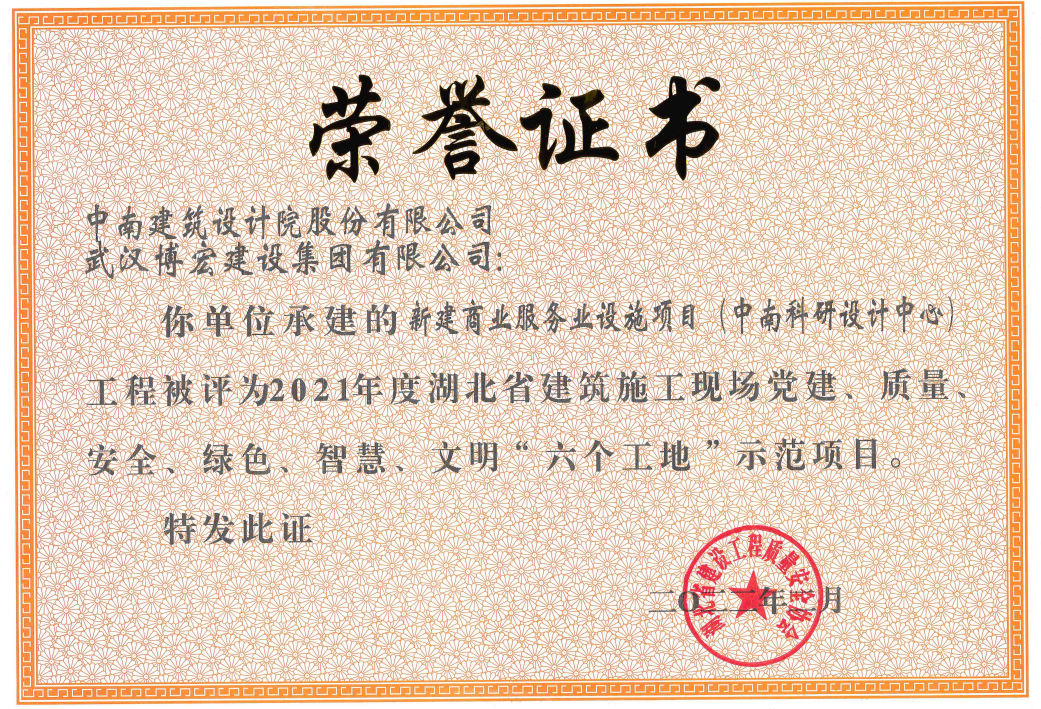 近日,2021年度湖北省建筑施工現場黨建、質量、安全、綠色、智慧、文明“六個工地”評比結果正式公布,全省共計97項工程被評為示范項目,博宏建設新建商業服務業設施項目(中南科研設計中心)和博宏建設旗下合資公司湖北長投建筑工程有限公司承建的荊門龍山中央商務區7#地塊項目雙雙獲獎。