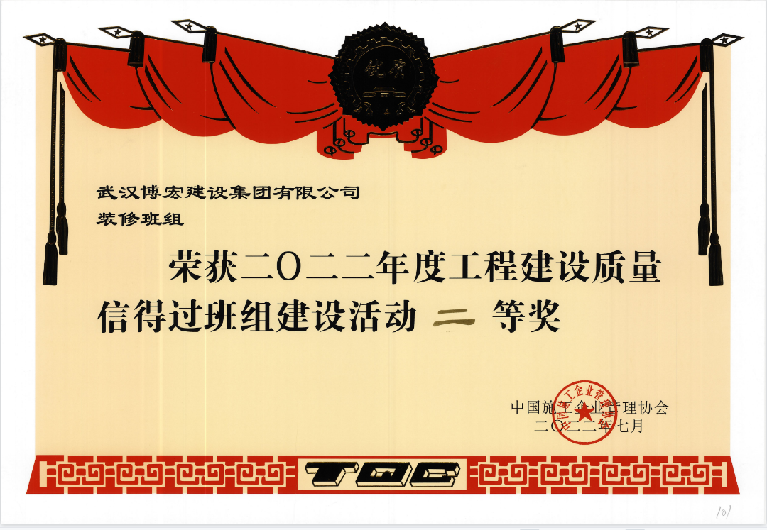 近日,博宏建設(shè)集團(tuán)裝修分公司榮獲中國施工企業(yè)管理協(xié)會頒發(fā)的2022年度工程建設(shè)質(zhì)量“信得過班組”建設(shè)活動“二等獎”以品質(zhì)工程,打造博宏品牌。