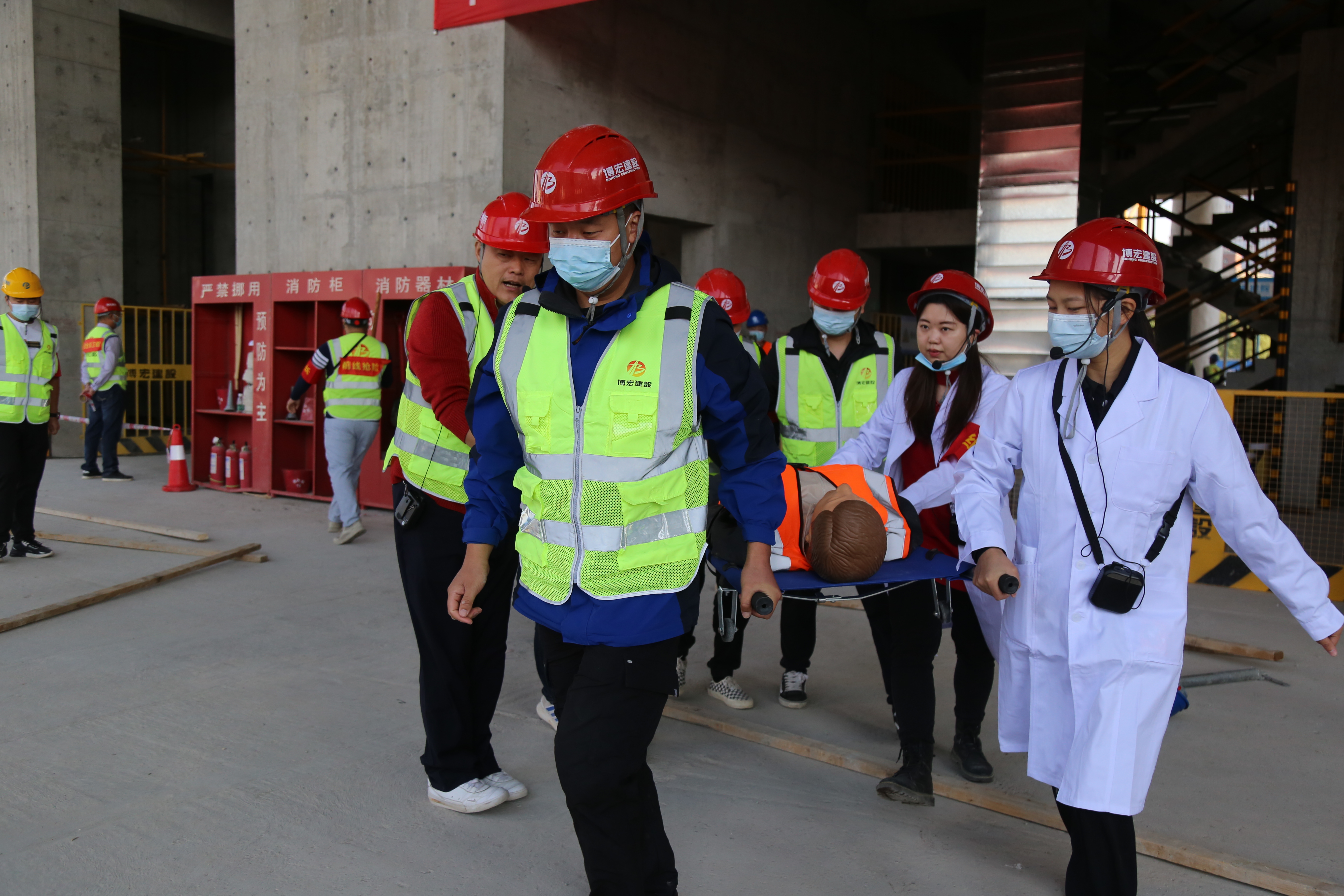 15日上午,一場緊張的安全生產應急演練在博宏建設集團中南科研設計中心項目舉行。武漢市城鄉建設局質量安全管理處副處長孫斌,武漢市漢陽區建設局黨組成員、建筑管理站站長王晟,武漢市漢陽區建筑管理站工會主席王永進,武漢市漢陽市政建設集團有限公司質安部部長程振東,博宏建設集團黨委書記、董事長、總經理鄒勇觀摩了本次安全演練活動,現場30余人參與演練。