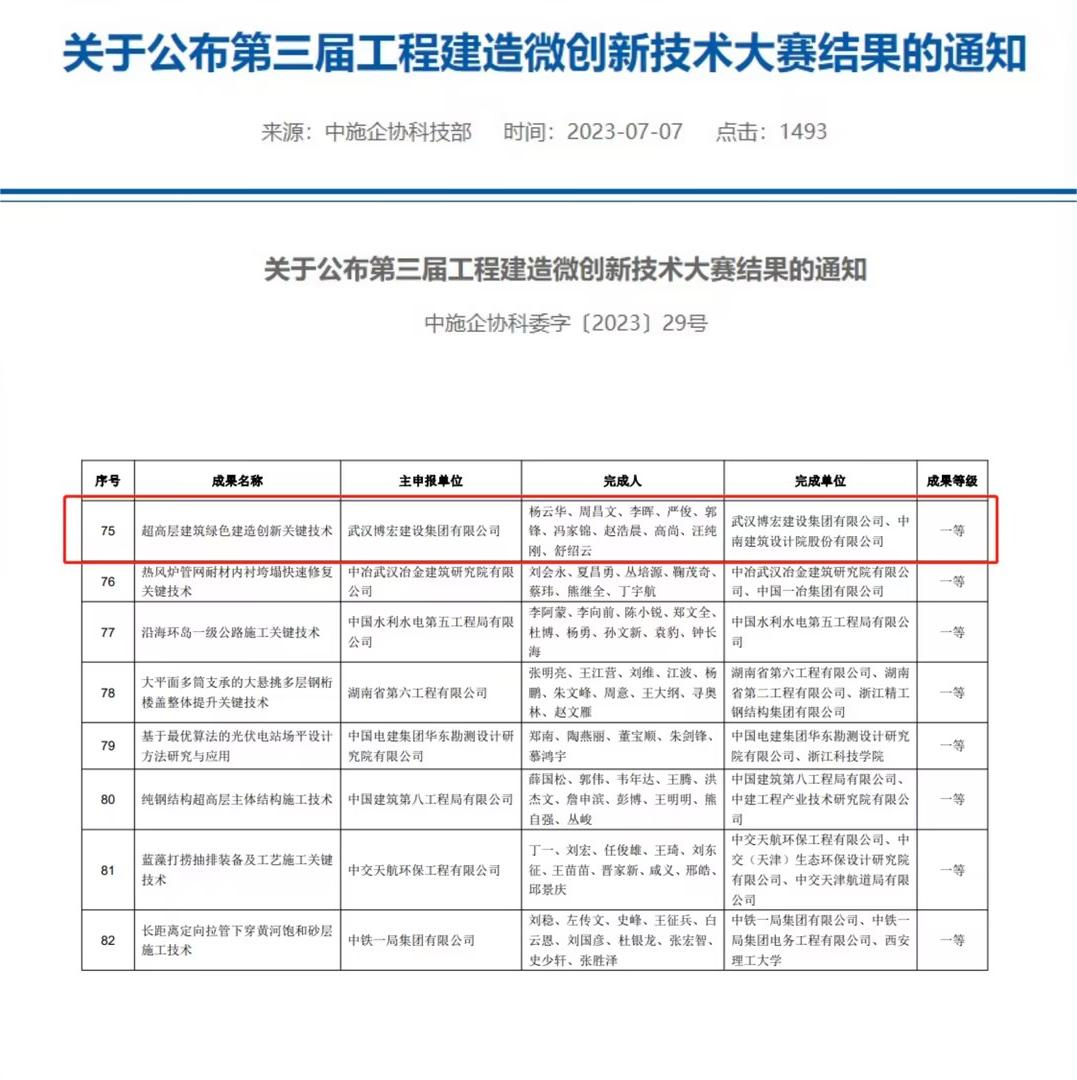 近日,中國施工企業管理協會公布第三屆工程建造微創新技術大賽獲獎結果。以中南科研設計中心建設項目為背景的“超高層建筑綠色建造創新關鍵技術”榮獲中施企協第三屆工程建造微創新技術大賽一等成果,這也是博宏建設集團首次獲得該類賽事一等獎