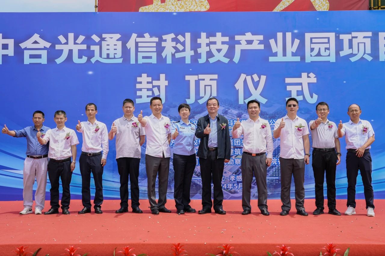上午 11 時 18 分,孝感市人大常委會副主任、臨空區工委書記邱顯春宣布項目喜封金頂,現場禮炮齊鳴,中合光通信科技產業園項目(一期)封頂儀式圓滿禮成!