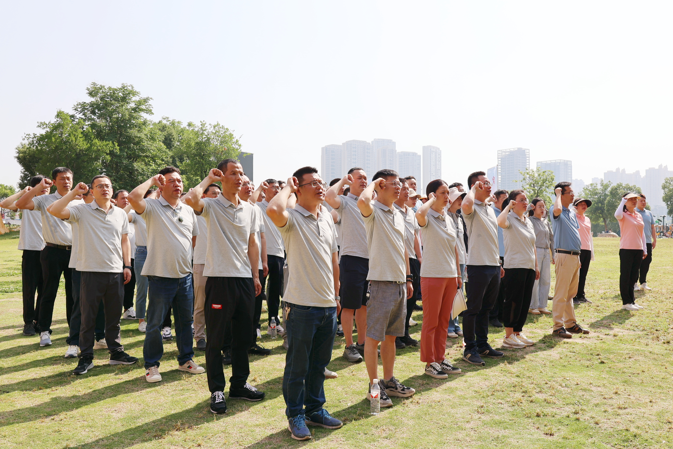 活動現場,全體人員整齊列隊,面對鮮紅的黨旗,高舉右拳,重溫入黨誓詞。